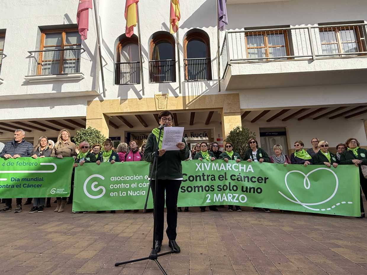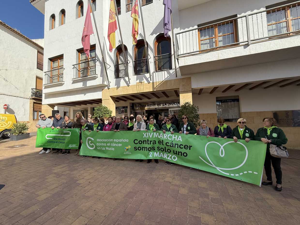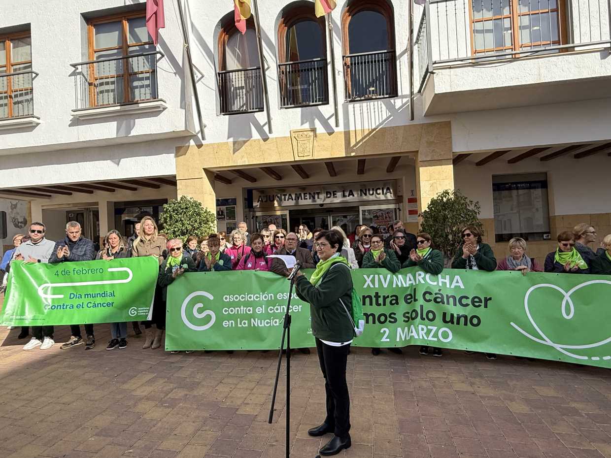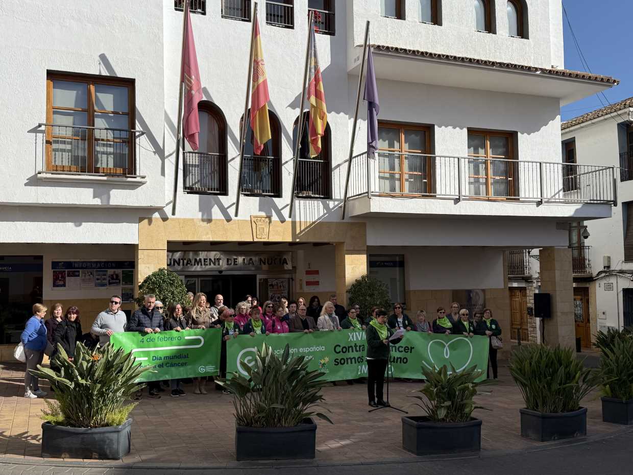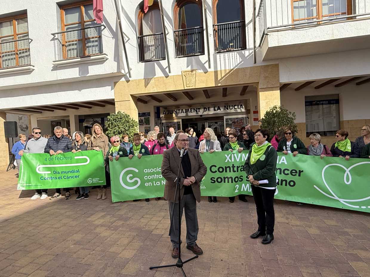 Hoy 4 de febrero La Nucía ha conmemorado el “Día Internacional contra el Cáncer” con la lectura de un manifiesto en la plaça Major por parte de la Junta Local de la Asociación Española contra el Cáncer en La Nucía. A su vez se ha colocado una pancarta den la fachada del Ayuntamiento. Además, a partir de esta noche los edificios municipales se iluminarán de verde, “color” de la lucha contra el cáncer, hasta el 2 de marzo, que se celebrará la tradicional “XIV Marcha Solidaria a Favor de la Lucha contra el Cáncer”.