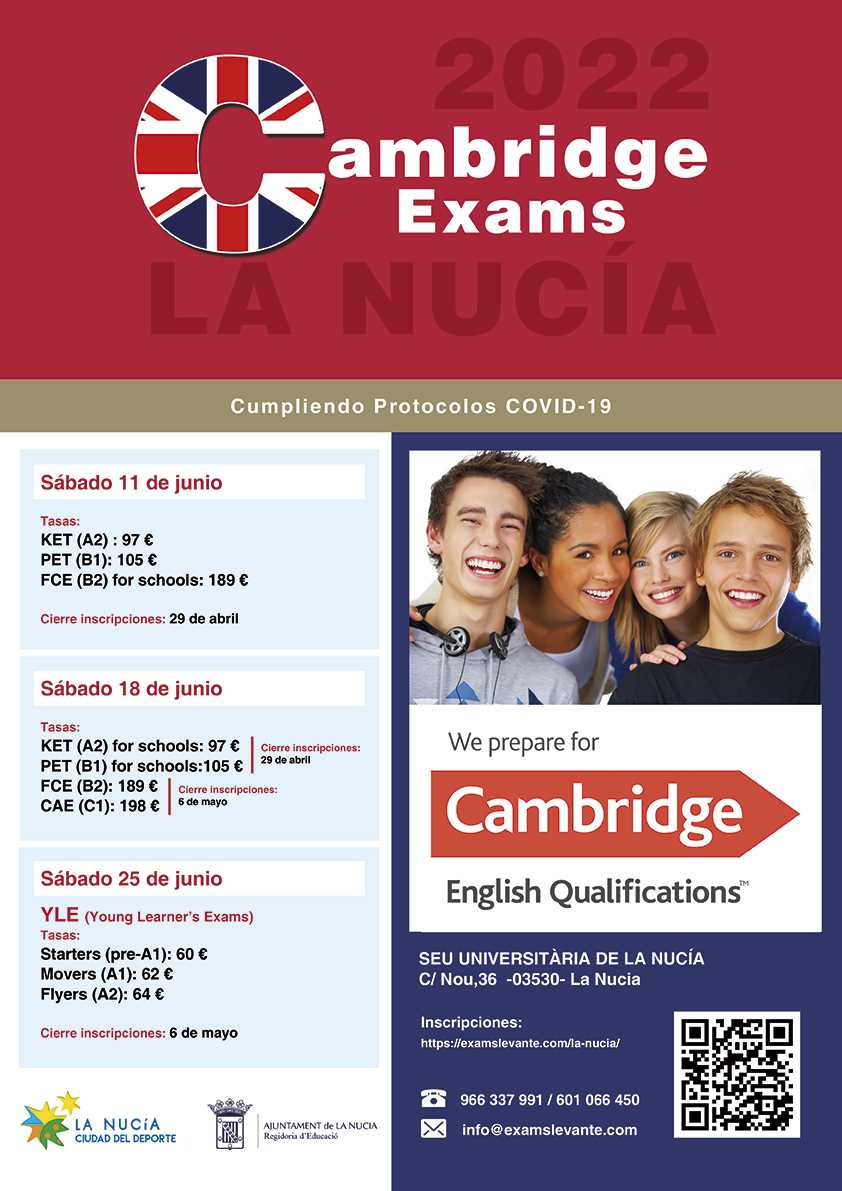Por noveno año la Seu Universitària de La Nucía será la sede de los exámenes anuales de Cambridge English Exams en la comarca de la Marina Baixa. Esto posibilitará poder examinarse en el mes de junio en La Nucía sin tener que desplazarse hasta Alicante. El plazo de matrícula para examinarse de Young Learners Exams (YLE), A2, B1, B2 y C1 ya está abierto. Los interesados deben inscribirse en www.examslevante.com/la-nucia/