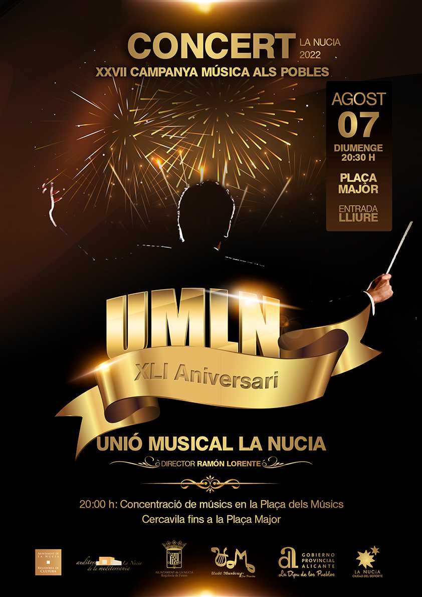 Este concierto de aniversario conmemora los años que va cumpliendo la banda nuciera desde su creación en 1981. En 2022 la banda de la Unió Musical de La Nucia cumple 41 años de intensa vida. Este concierto será también el primer acto oficial para la reina de les Festes d´Agost 2020, Teresa Mercado Llorens.
