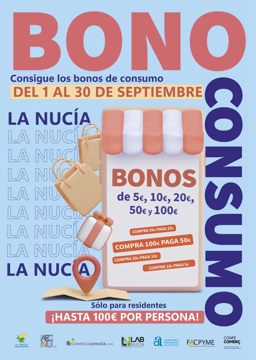 Durante el mes de septiembre los vecinos y vecinas podrán adquirir “Bonos Consumo” de 5, 10, 20, 50 y 100 euros, a través de la web www.lanuciabonoconsumo.es. Hasta un máximo de 100 euros por persona. Con estos Bonos Consumo se podrá comprar y consumir en La Nucía en los comercios adheridos a la campaña durante el mes de septiembre y “ganar el doble” ya que al comprar con el “bono consumo” el valor se duplica. Porque al comprar el bono de 5 € el consumidor paga 2,5 €, de un bono de 10 € paga 5 €, del de 20 € paga 10 €, del de 50 paga 25 € y del de 100 € paga 50 €.