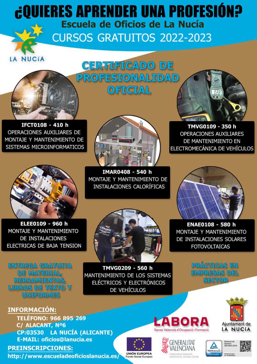 Este curso 2022-2023 la Escuela de Oficios oferta 6 cursos gratuitos para personas desempleadas. Sólo quedan las últimas plazas de las 90 ofertadas, dada su gran demanda. Las inscripciones son gratuitas y se realizan a través de la web: http://www.escueladeoficioslanucia.es o en la misma Escuela de Oficios en La Nucía (carrer Alacant, frente a Correos, 966895269).
