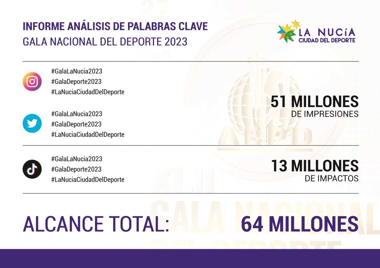 Los hashtag #GalaLaNucia2023, #LaNuciaCiudadDelDeporte y #GalaDeporte2023 del 25 al 31 de marzo tuvieron un total de 64 millones de impactos en las redes sociales de Instagram, Twitter y TikTok.