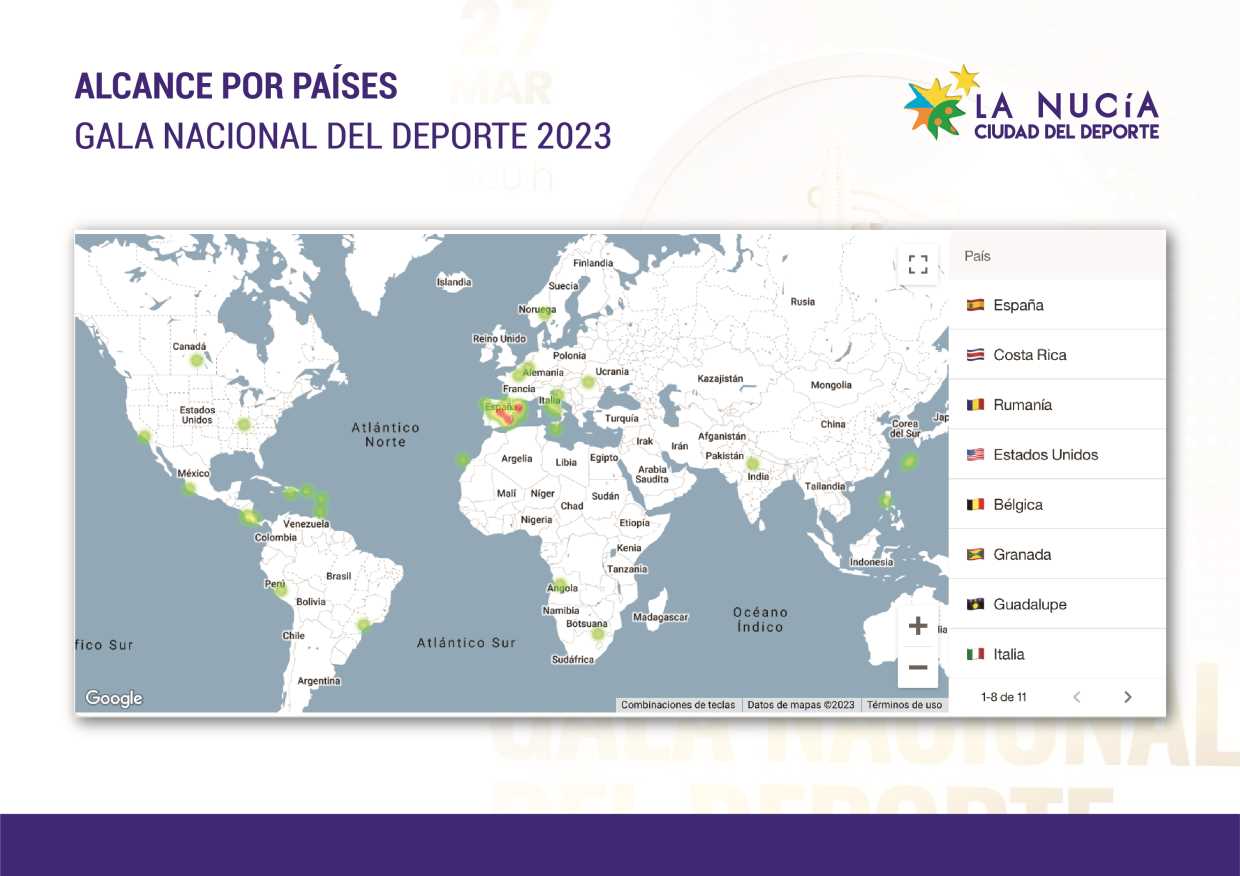 Los impactos de la Gala Nacional del Deporte en las redes sociales no fueron sólo en España sino en 11 diferentes países: España, Italia, Estados Unidos, Bélgica, Costa Rica, Rumanía, Granada, Guadalupe, México, Perú y Ecuador.