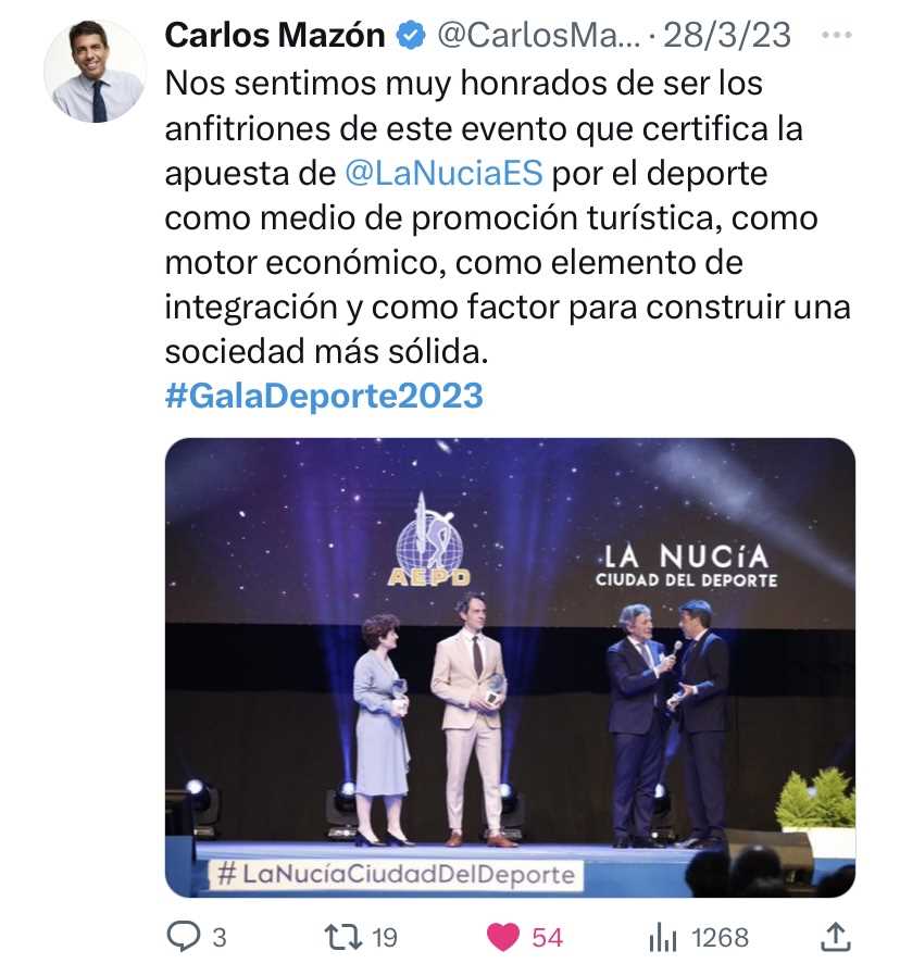 Unas cifras “impresionantes” para un acto desarrollado en el Pabellón Municipal Camilo Cano de La Nucía, que apareció en diferentes perfiles de medios de comunicación deportiva como @teledeporte, @diarioas, @apuntesports, @marca o en las cuentas oficiales de Twitter de deportistas o clubs premiados como @SandraSanKarate, @RaquelGlezCampos, @soysamusanchez, @realmadrid,