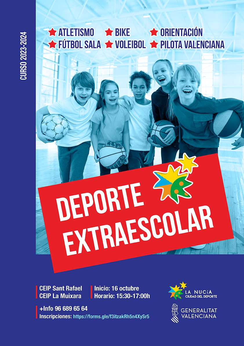 Atletismo, Bike, Orientación, Fútbol Sala, Voleibol, Pilota Valenciana y Psicomotricidad (5 años) son las actividades ofertadas por la Generalitat Valenciana y la concejalía de Educación para este curso 2023-2024, en los dos colegios públicos. Las actividades son totalmente gratuitas para el alumnado y arrancarán el lunes 16 de octubre.