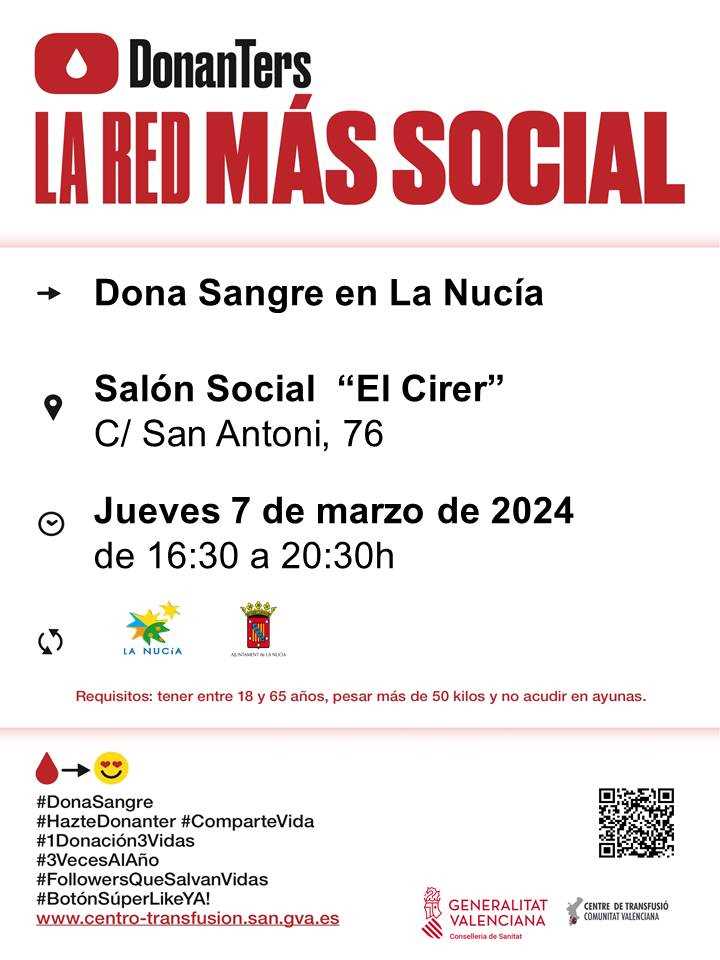 El jueves 7 de marzo, de 16,30 a 20,30 horas, se realizará una nueva “Donación de Sangre” en el Salón Social El Cirer. Será la cuarta captación de sangre de 2024 en La Nucía, a cargo del Centro de Transfusión de la Comunitat Valenciana. Para donar sangre no es necesario preinscribirse, ni tener carnet de donante. Desde la concejalía de Sanidad se recuerda que “la sangre es más necesaria que nunca, por las peticiones de los hospitales de la provincia”, por lo que hace un llamamiento a participar en la donación de sangre.