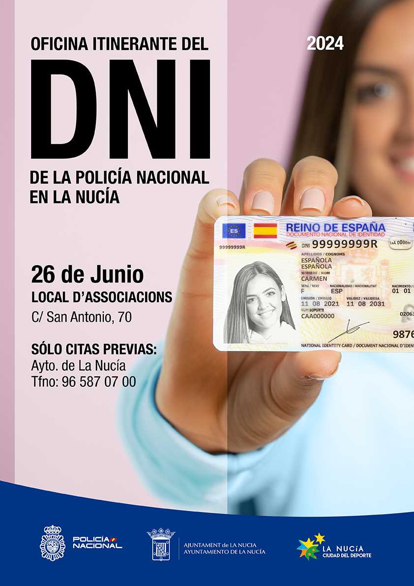 La oficina itinerante del DNI de la Policía Nacional vuelve a La Nucía el miércoles 26 de junio de 2024. Esta oficina del DNI se situará en el Local d’Associacions y atenderá sólo citas previas, que se dan en el Ayuntamiento de La Nucía (965870700). El cupo por visita está en 100 citas, por lo que las plazas son limitadas. Se recomienda a todos los vecinos y vecinas interesados solicitar la cita lo antes posible.
