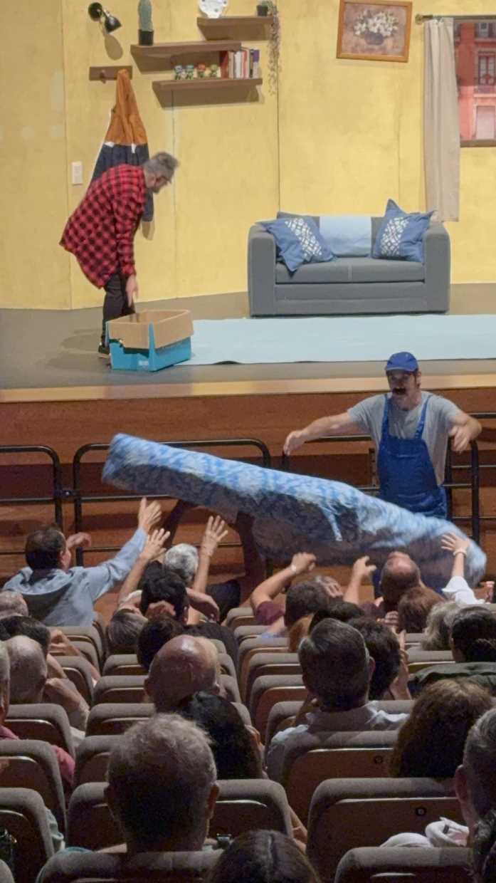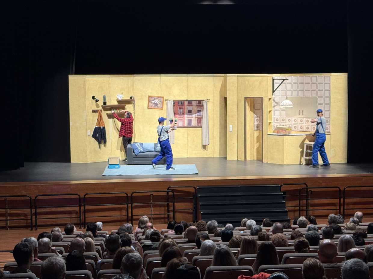 Desde el primer minuto se vio la conexión con el público nuciero que enseguida se metió en esta “locura cómica desbordante”, interactuando con los actores, e incluso colaborando con ellos cuando bajaban al patio de butacas, aunque alguno se llevó más escobazos de los esperados. En este montaje teatral incluso los animales tienes su protagonismo, como un gato y especialmente cuatro palomas que desde la ventana ven pasar la “hilarante vida cotidiana de Tomás” en su reducido piso de soltero, por el que pasa la mayor parte de la acción. A través de proyecciones y con juegos de luces nos trasladan a otras ubicaciones, donde trabaja sin éxito siempre Tomás, al “que la vida no le sonríe”. Pero Clownic lo trata con humor y nos hace reír con las miserias y tuperwares de este “extraordinario hombre normal”, a la vez que introduce cierta crítica social actuales (el acceso a la vivienda, la precariedad laboral, la dependencia de los padres….) para hacer pensar al público mientras se ríe de la vida da Tomás, en la que algún aspecto se ve reflejado en él. También nos da esperanzas de como la amistad, la solidaridad y empatía con los que lo están pasando mal, al final siempre triunfa.