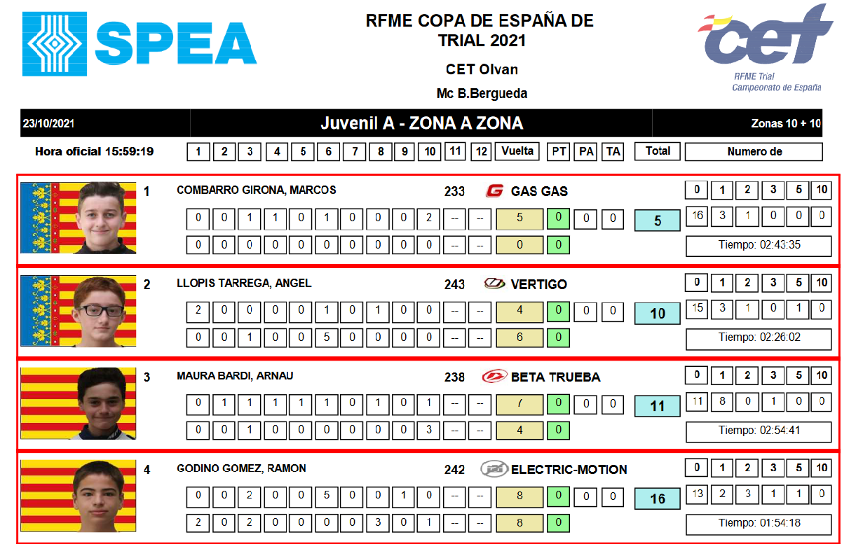 Marcos Combarro ha rendido a un gran nivel, consiguiendo cuatro primeros puestos en las cuatro pruebas del nacional de trial. El joven piloto sumó los 20 puntos en las cuatro pruebas, para acabar con la máxima puntuación posible: 80 puntos. La clasificación general final del Campeonato de España de Trial “Juvenil A” RFME quedó de la siguiente forma: 1º Marcos Combarro 80 puntos, 2º Arnau Maura 66 puntos y 3º Ángel Llopis 60 puntos.