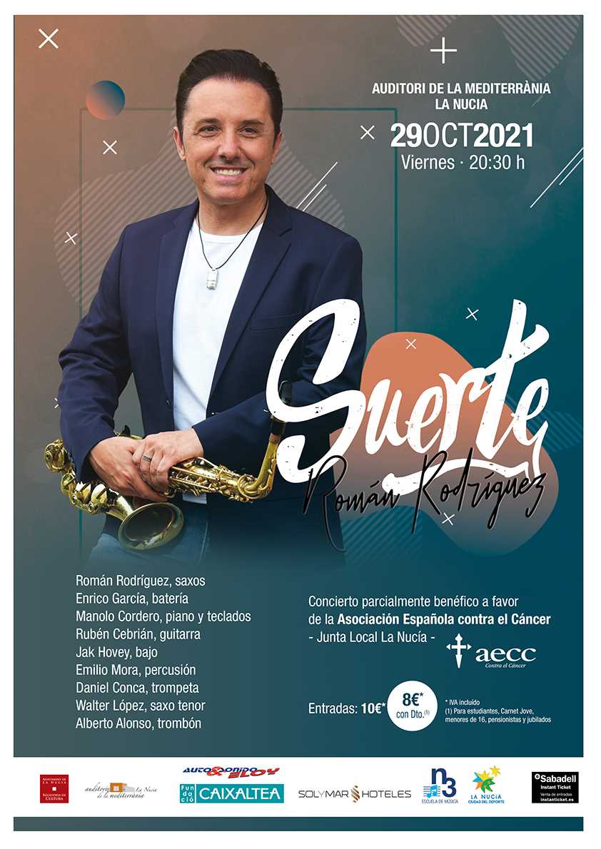 El músico y saxofonista Román Rodríguez presenta su nuevo disco “Suerte” con un concierto este viernes 29 de octubre a las 20,30 horas en l’Auditori de La Nucía. Se trata del quinto álbum en solitario de Román Rodríguez, ex saxofonista de Café Quijano. Será una actuación solidaria ya que parte de la recaudación se destinará a la Junta Local de La Nucía de la Asociación Española contra el Cáncer. Las entradas están a la venta en las taquillas de l’Auditori y en instanticket.es