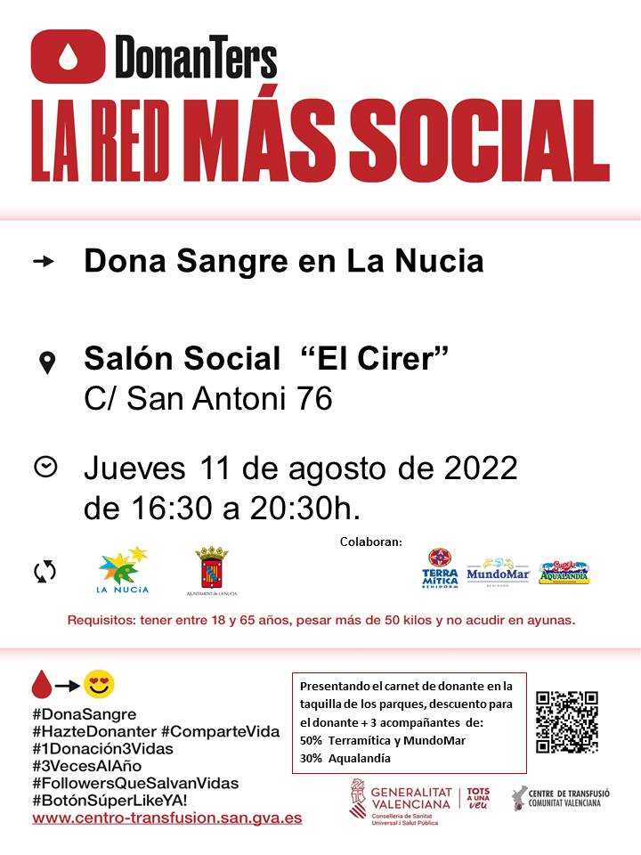El Salón Social El Cirer acogerá una nueva donación de sangre el próximo jueves 11 de agosto por la tarde, de 16,30 a 20,30 horas. El Centro de Transfusión de la Comunidad Valenciana se desplaza a La Nucía para realizar la decimocuarta captación de sangre de 2022. Para donar sangre no es necesario preinscribirse, ni tener carnet de donante.