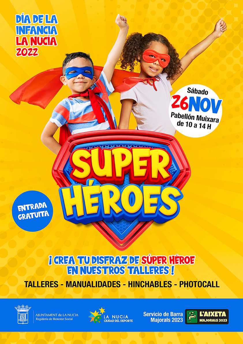 La Concejalía de Bienestar Social de La Nucía conmemorará el XIV Día Internacional de la Infancia este sábado 26 de noviembre de 10 a 14 horas en el parking del Pabellón Muixara. Habrá 11 talleres relacionados con los Super Héroes, hinchables, photocall, fotomatón y mucha diversión para los más peques. La entrada será libre y gratuita.