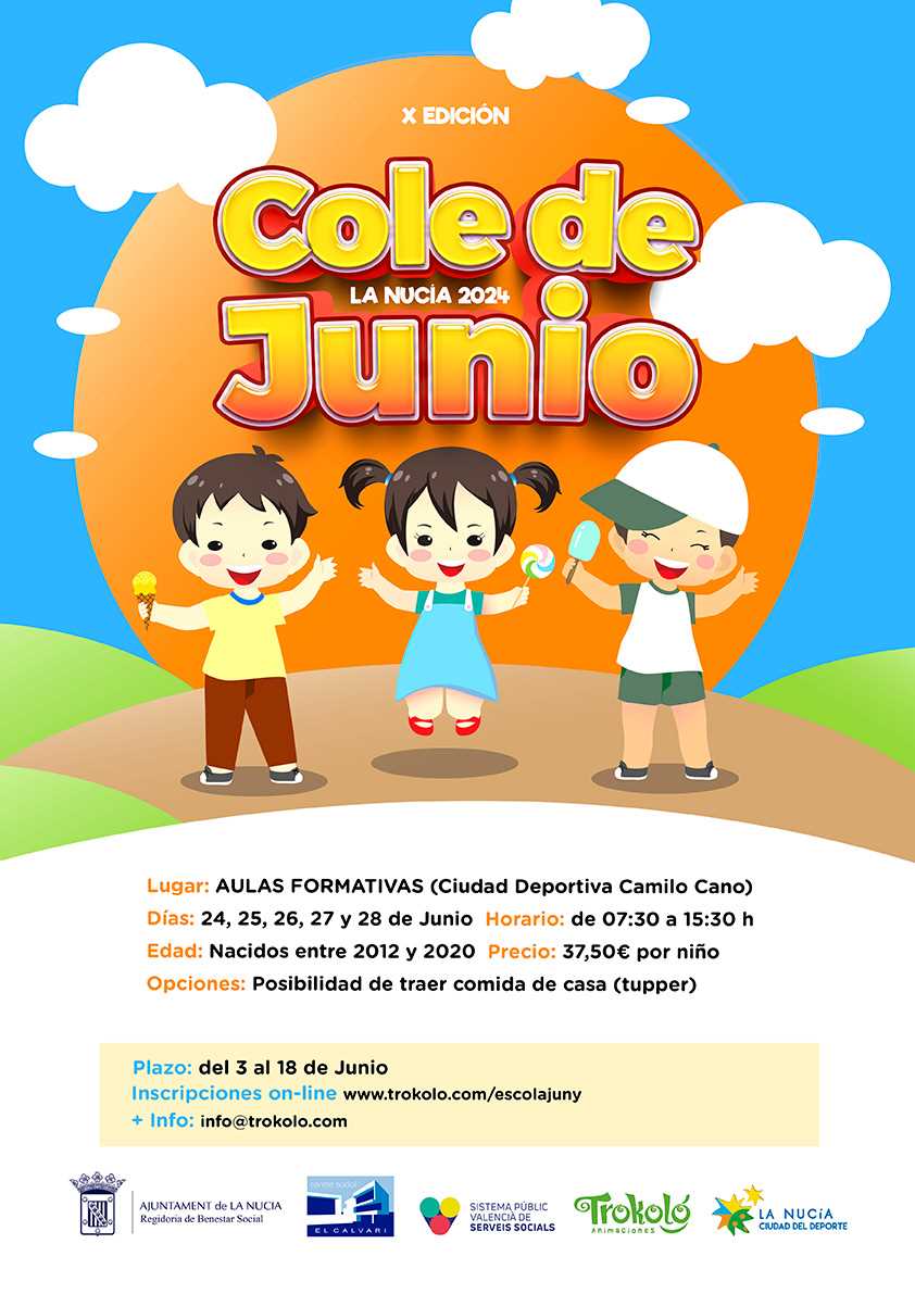 Hoy lunes 3 de junio abre sus inscripciones el “X Cole de Junio” de La Nucía, en el Centro Social El Calvari y la web http://www.trokolo.com/escolajuny . Esta actividad se desarrollará durante sietes días, del 24 al 28 de junio de 2024 en las Aulas Formativas de la Ciutat Esportiva Camilo Cano de La Nucía y está orientada a escolares de 4 a 12 años.