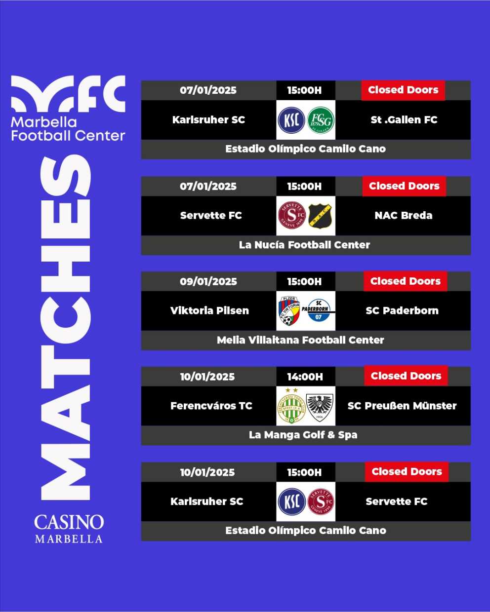 El viernes 10 de enero a las 15 horas para finalizar su stage jugarán un partido el Karlsruher SC y el Servette FC, en el Estadi Olímpic Camilo Cano, también a puerta cerrada.