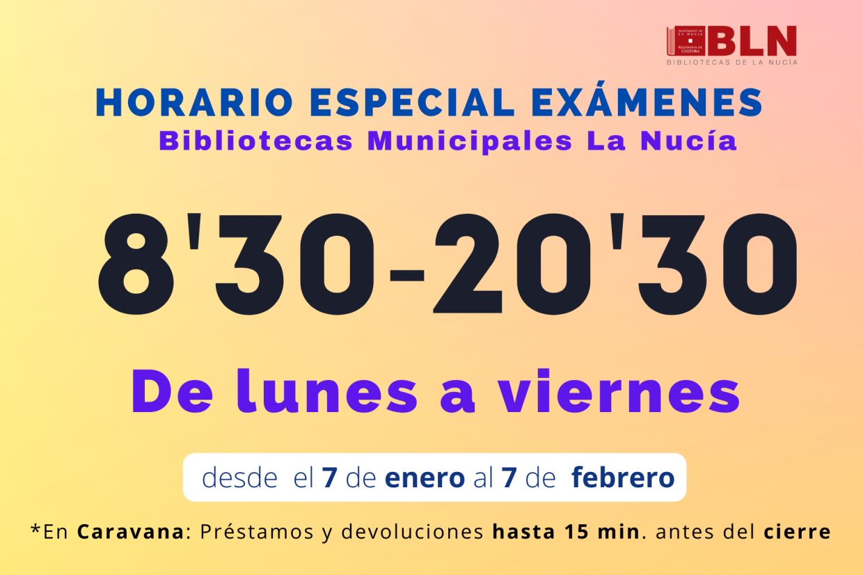 Hoy martes 7 de enero las bibliotecas de La Nucía comienzan su horario extraordinario de exámenes, que tendrá una duración de un mes hasta el 7 de febrero. Un año más desde la concejalía de Cultura toma esta medida para facilitar el estudio a l@s estudiantes nucier@s, en época de exámenes. Desde hoy las dos bibliotecas (Caravana y Auditori) están abiertas doce horas al día ininterrumpidamente, desde las 8,30 de la mañana hasta las 20,30 horas.