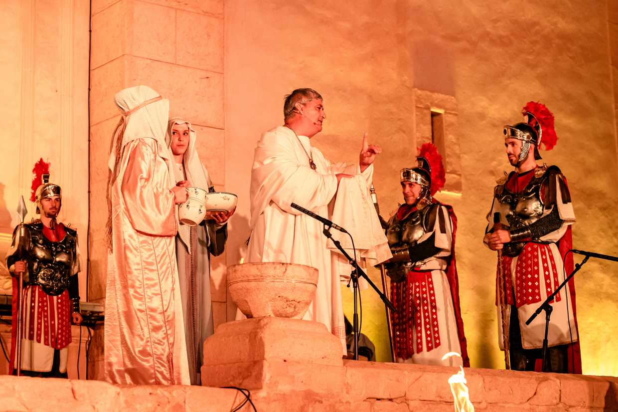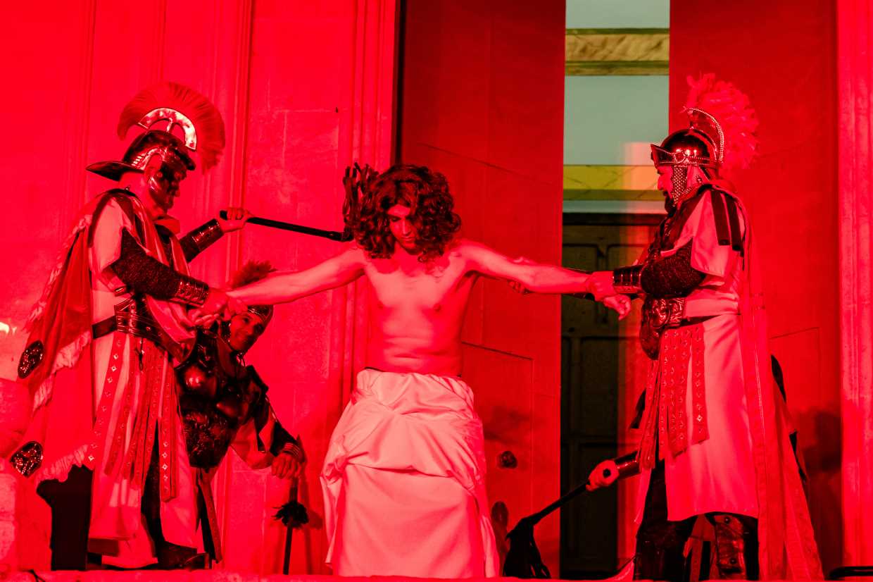 Con el escenario de la escalinata de la Iglesia y el Calvari de fondo en “La Passió” se representan las últimas 13 escenas de Jesucristo antes de ser crucificado, combinando luz, teatro, música y fuego. En la plaça Major se representan 6 escenas teatralizadas, con la incorporación de una nueva El Llavatori de Peus (novedad 2025), además de las tradicionales: L’últim sopar, Monte de les Oliveres, el Prendiment de Jesús, les Negacions de Sant Pere y el Judici i Condemna de Pilat. El juego de luces y música añade solemnidad a estas escenas teatralizadas, la última de ellas sobre la espectacular escalinata de piedra de la Iglesia, que se convierte en el templo romano de Pilatos, durante unas horas.