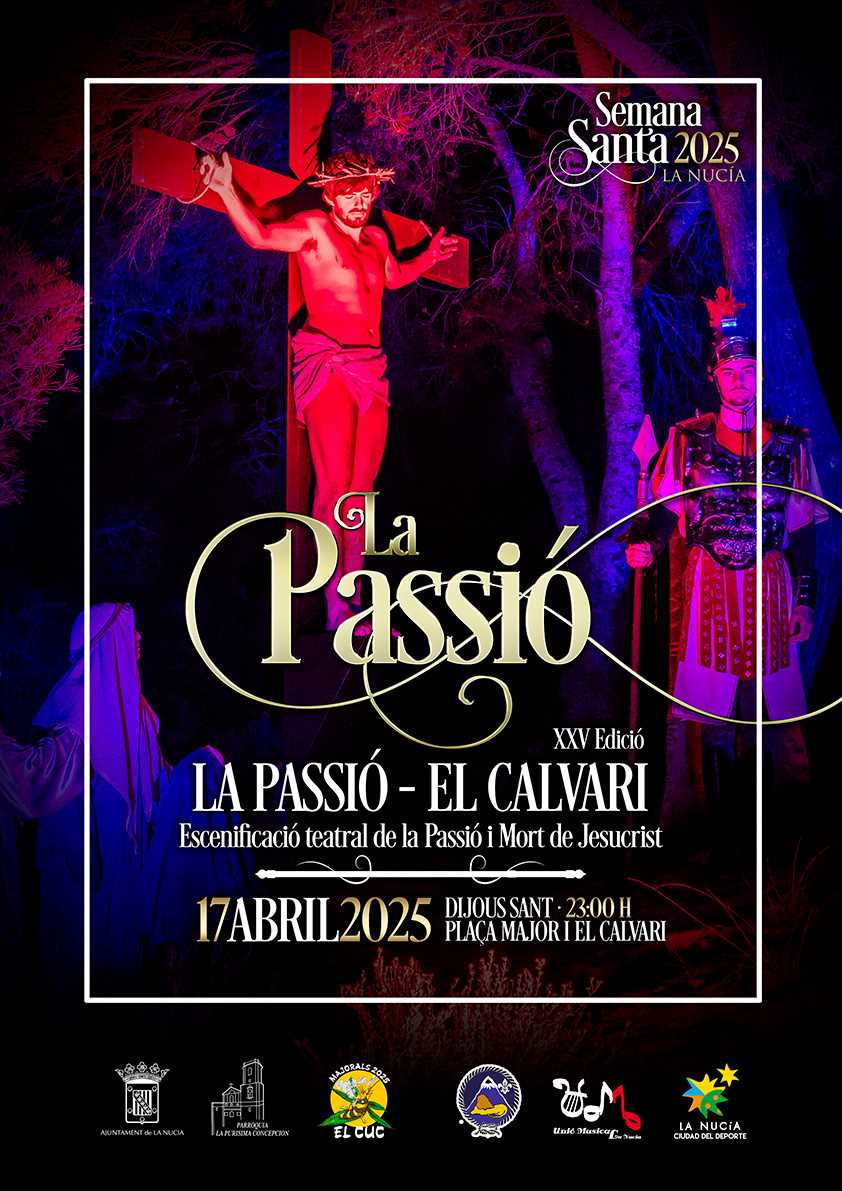 Esta representación teatral de “La Passió” (Pasión y Muerte de Jesucristo) está coordinada por las concejalías de Cultura y Fiestas de La Nucía con la colaboración de la Parroquia de La Nucía, el Grup Scout La Nucía, Grupo de Teatro de La Nucía y els Majorals 2025-Penya El Cuc. Es una escenificación teatral religiosa y un espectáculo cultural al aire libre, bajo la luz de la luna llena, con un espectacular marco como son la plaça major con su escalinata de piedra y el paraje natural del monte Calvari, con unas sensacionales panorámicas hacia La Nucía, bahía de Altea, círculo montañoso y toda la comarca.