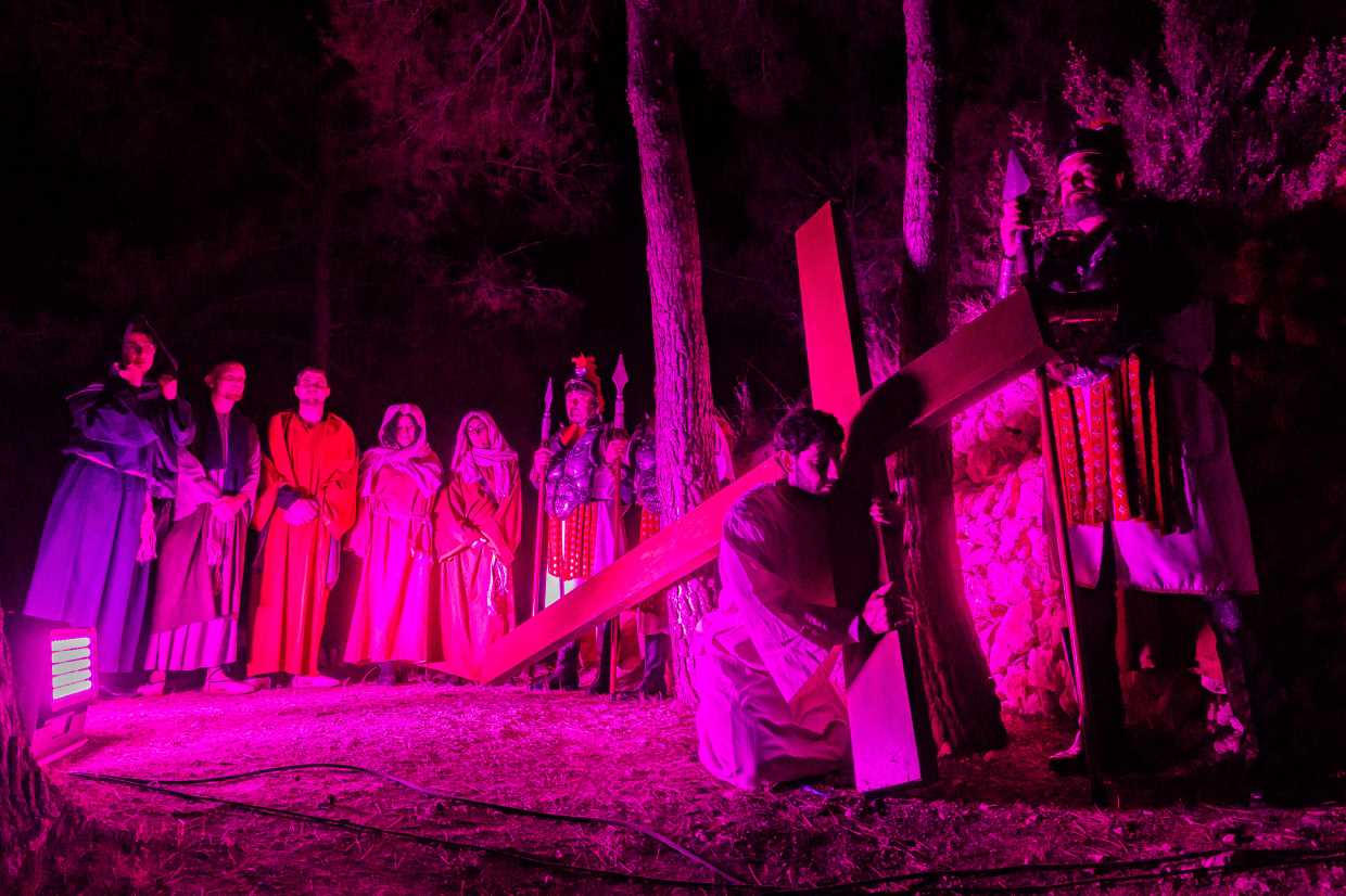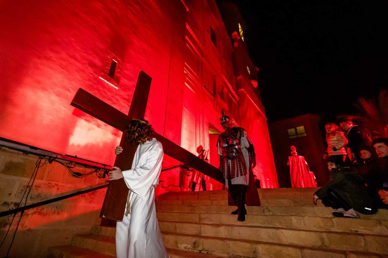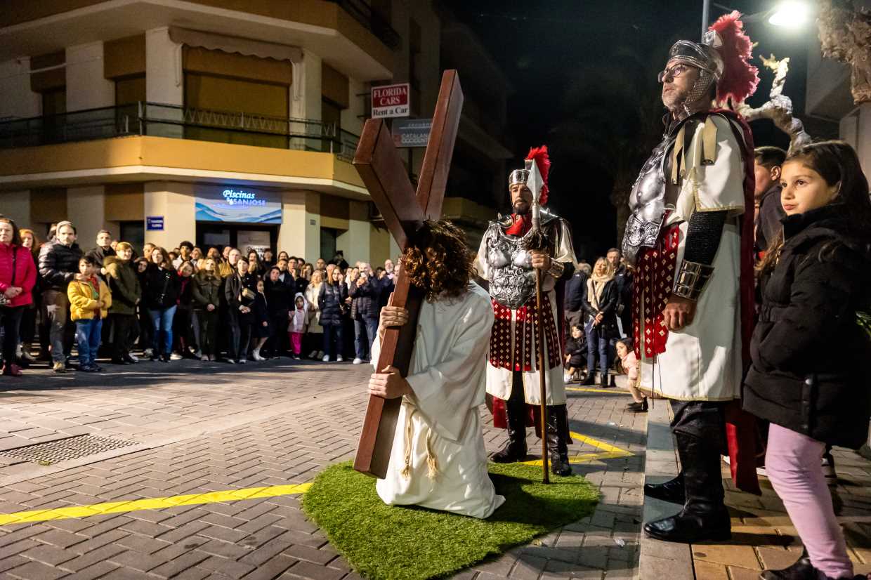 Después se realiza otra escena “La primera caiguda de Jesús” en la subida, en la esquina de la av. Església con el carrer Joaquín Berenguer. El resto de las 6 escenas se escenifican en las curvas de subida al monte “Calvari”: “Cirineo”, “Verónica”, “Segona caiguda”, “Clavant a Jesús en la Creu”, “Jesús es crucificat” y “Baixada de la Creu”. El marco natural de “El Calvari” perfectamente conservado, sin ninguna edificación y rodeado de naturaleza bajo la luz de la luna llena (al ser Jueves Santo) convierte a estas escenas fijas vivientes sobre las Pasión y Muerte de Jesucristo, en todo un espectáculo que reúne cada año a cientos de personas, tanto creyentes como no creyentes.
