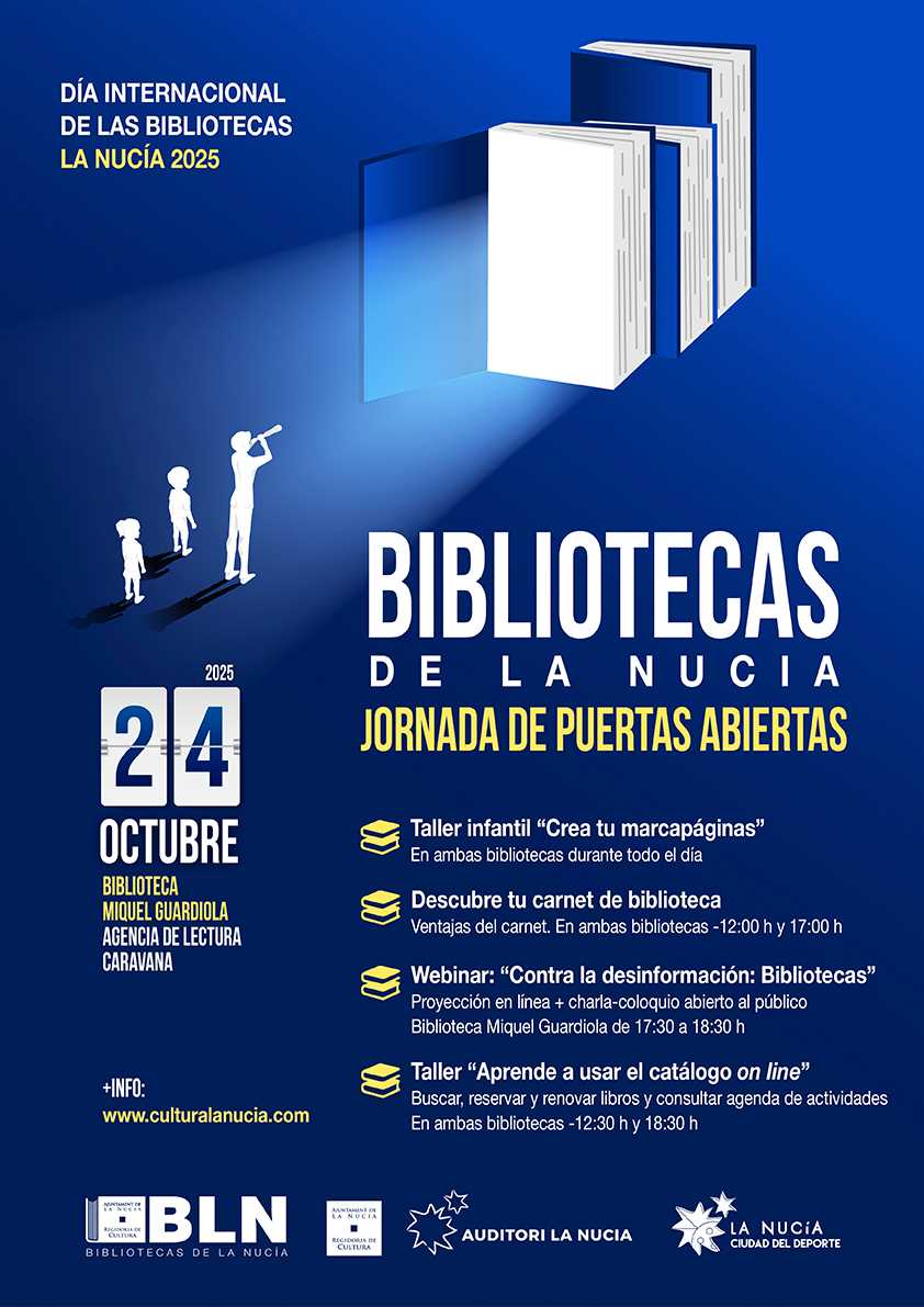 Durante toda la jornada, las bibliotecas de La Nucía ofrecerán diversas actividades con el objetivo de dar a conocer sus recursos, servicios y posibilidades de uso: taller infantil “Crea tu propio marcapáginas”, charla “Descubre tu carnet de biblioteca” será a cargo de la técnico de bibliotecas (dos sesiones a las 12 y 17 horas en las dos bibliotecas), Webinar “Contra la desinformación: Bibliotecas” (17,30 horas) Proyección en línea organizada por la Dirección General del Libro, del Cómic y de la Lectura, seguida de una charla-coloquio con el personal bibliotecario de La Nucía, abierta a la participación ciudadana y taller “Aprende a usar el catálogo” (dos sesiones, a las 12:30h y 18:30h, en ambas bibliotecas).