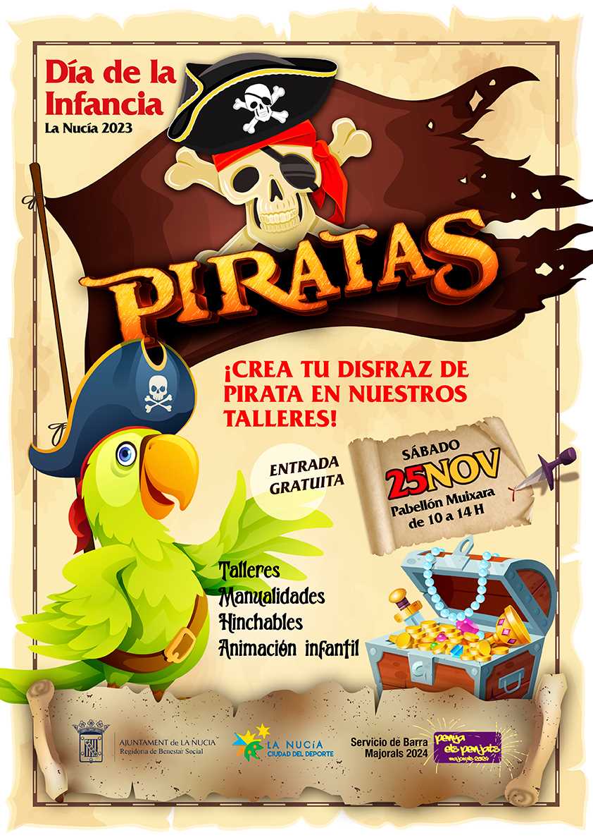 La Concejalía de Bienestar Social de La Nucía conmemorará el XV Día Internacional de la Infancia este sábado 25 de noviembre de 10 a 14 horas en el parking del Pabellón Muixara. Habrá 11 talleres relacionados con los Piratas, hinchables y mucha diversión para los más peques. La entrada será libre y gratuita.
